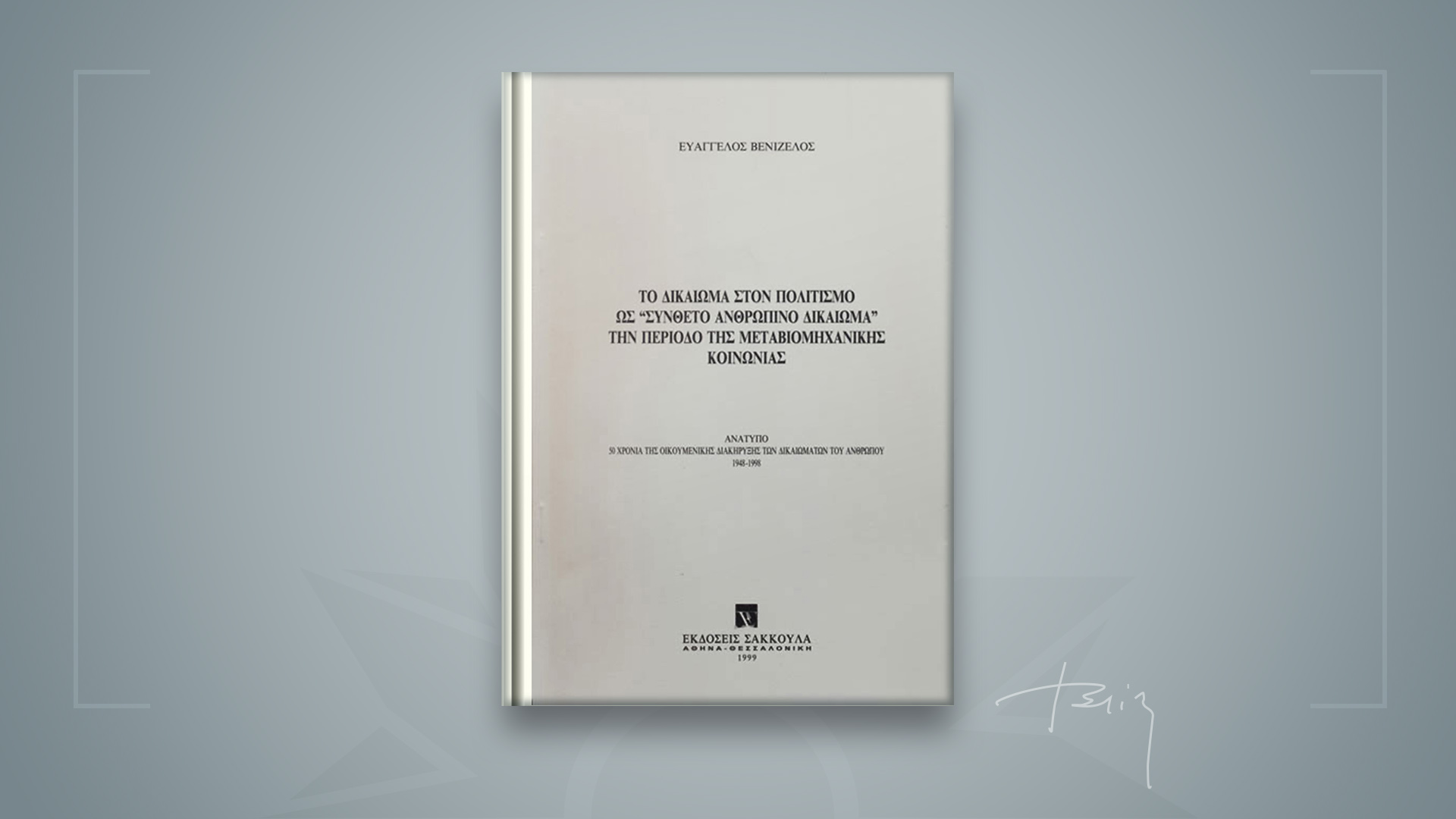 Ευ. Βενιζέλος, Το Δικαίωμα στον Πολιτισμό ως " Σύνθετο Ανθρώπινο Δικαίωμα " την περίοδο της Μεταβιομηχανικής κοινωνίας, Ανάτυπο, εκδ. Σακκουλα, 1999 [PDF 4mb]