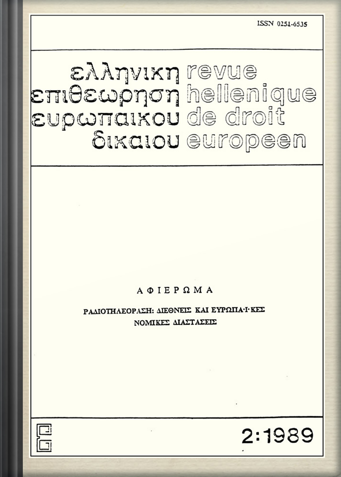 * Eισήγηση στο συνέδριο που οργάνωσε το Kέντρο Διεθνούς και Eυρωπαϊκού Oικονομικού Δικαίου με θέμα “Pαδιοτηλεόραση: Διεθνείς και ευρωπαϊκές νομικές διαστάσεις” (Θεσσαλονίκη 14-15.3.1989)