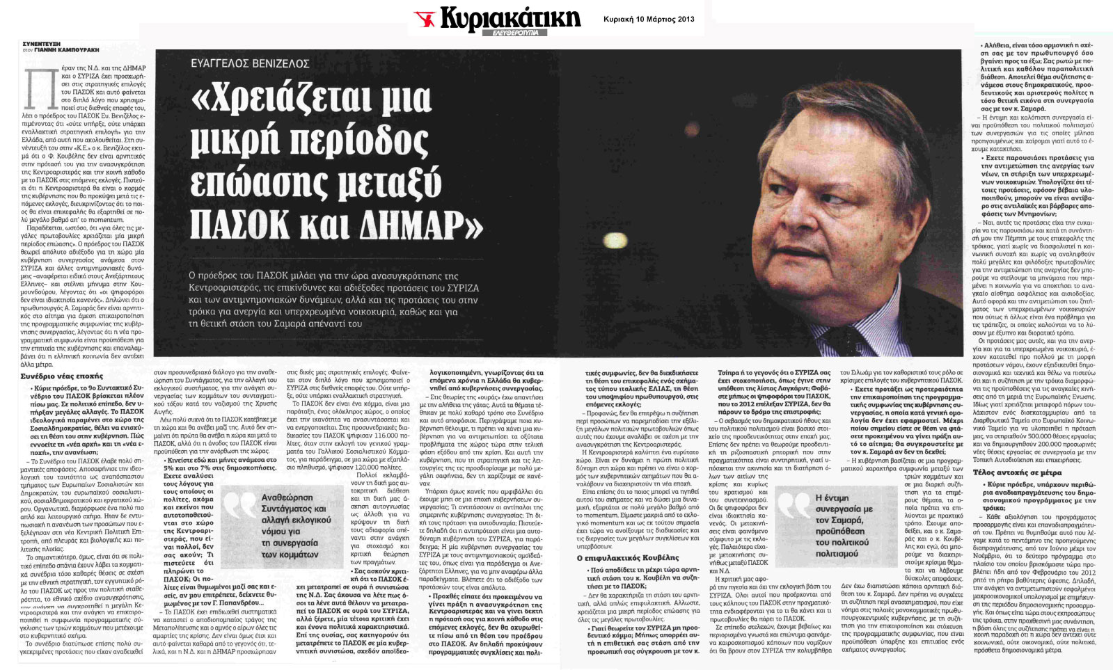 Ο πρόεδρος του ΠΑΣΟΚ μιλάει για την ώρα ανασυγκρότησης της Κεντροαριστεράς, τις επικίνδυνες και αδιέξοδες προτάσεις του ΣΥΡΙΖΑ και των αντιμνημονιακών δυνάμεων, αλλά και τις προτάσεις του στην τρόικα για ανεργία και υπερχρεωμένα νοικοκυριά, καθώς και για τη θετική στάση του Σαμαρά απέναντι του.