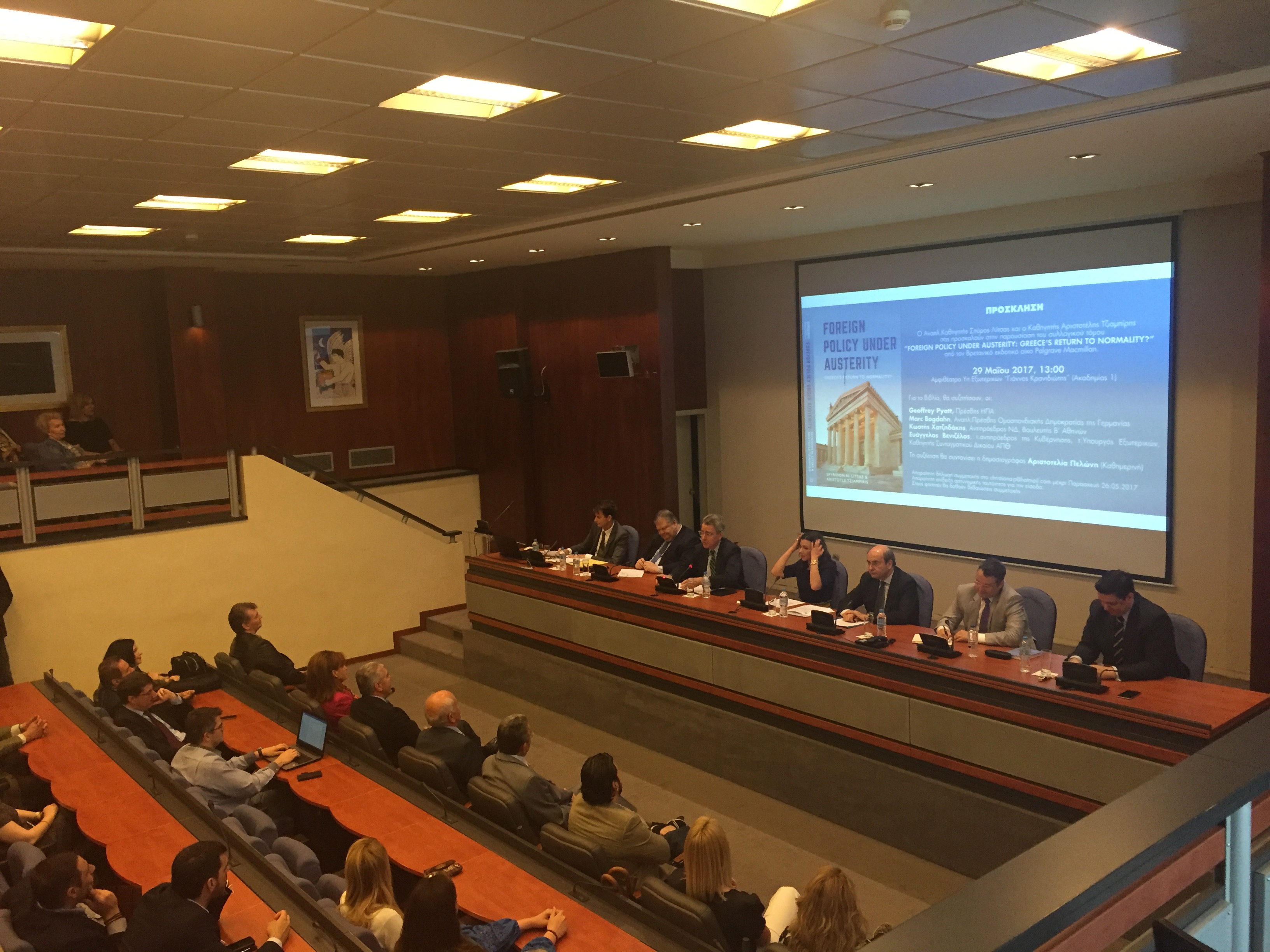 Ομιλία Ευάγγελου Βενιζέλου στην παρουσίαση του συλλογικού τόμου «Foreign policy under austerity : Greece's return to normality ?» (Pallgrave/ Macmillan, 2017) των Spyridon Litsas / Aristotelis Tziambiris, με τον Πρέσβη των ΗΠΑ, Geoffrey R. Pyatt, τον Επιτετραμμένο της Ομοσπονδιακής Δημοκρατίας της Γερμανίας, Marc Bogdahn, τον Αντιπρόεδρο της ΝΔ, Κωστή Χατζηδάκη. Τη συζήτηση συντόνισε η δημοσιογράφος Αριστοτελία Πελώνη