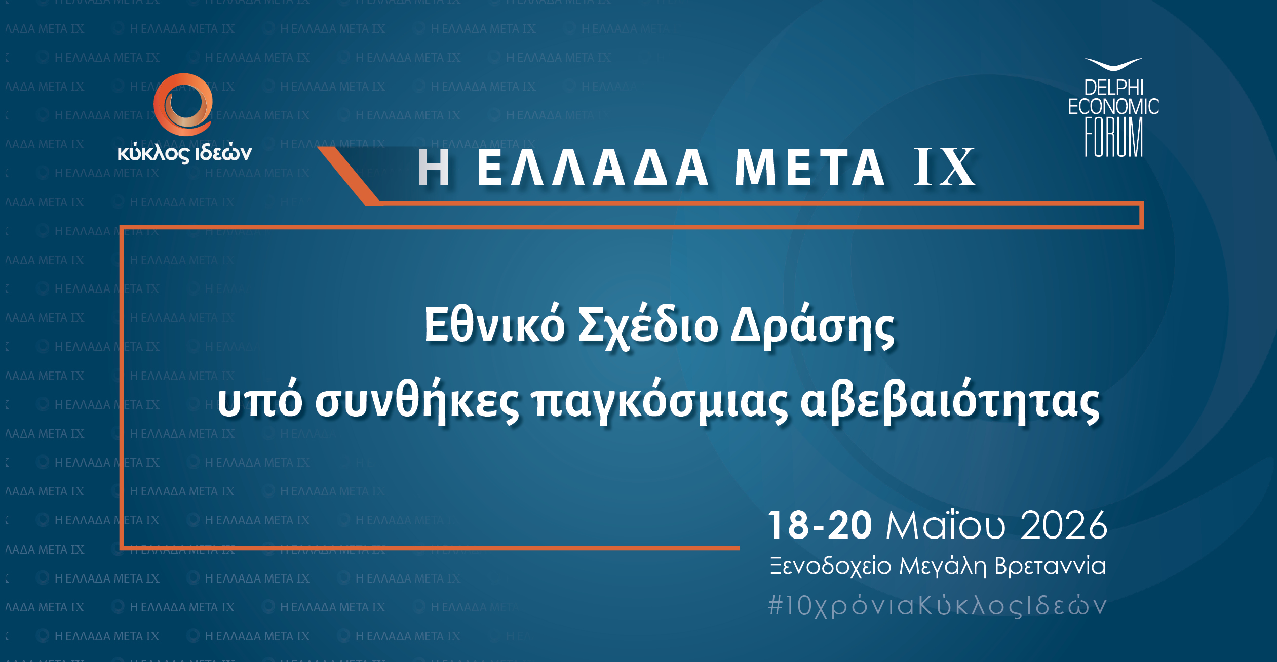 Για ένατη χρονιά ο Κύκλος Ιδεών διοργανώνει, σε συνεργασία με το Delphi Economic Forum, το ετήσιο συνέδριό του που εντάσσεται στη σειρά συνεδρίων με τον τίτλο «Η Ελλάδα Μετά». Το συνέδριο «Η Ελλάδα Μετά IX» θα διεξαχθεί 18-20 Μαΐου 2026 στην Αθήνα, στο ξενοδοχείο Μεγάλη Βρεταννία, με ειδικότερο θέμα: «Εθνικό σχέδιο δράσης σε συνθήκες παγκόσμιας αβεβαιότητας»