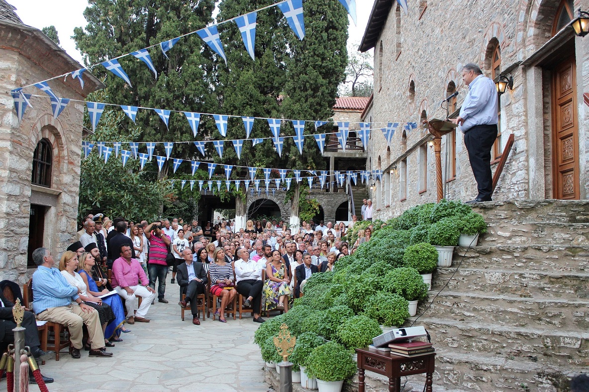 Πανοσιολογιότατε, σας ευχαριστούμε πολύ που μας φιλοξενείτε στον περίβολο της μονής σας που τόσο αγάπησε ο Δημήτρης και που τόσο αγαπάμε και εμείς. Έχουμε περάσει πολλά δειλινά εδώ, μαζί με το Δημήτρη και έχουμε ψάλει στο καθολικό του ναού πολλές φορές, κυρίως τη μεγάλη εβδομάδα. Σας ευχαριστούμε λοιπόν γιατί μας προσφέρετε αυτό το περιβάλλον, θρησκευτικό και πολιτιστικό ταυτόχρονα. Και χάρηκα προσωπικά ιδιαίτερα βλέποντας αναστηλωμένη, ανακαινισμένη, ζωντανή, τη μονή αυτή με τη δική σας ηγουμενία.