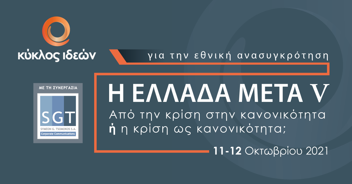 Για πέμπτη χρονιά ο ΚΥΚΛΟΣ ΙΔΕΩΝ διοργανώνει, σε συνεργασία με τη ΣΥΜΕΩΝ Γ. ΤΣΟΜΩΚΟΣ ΑΕ, το ετήσιο συνέδριό του με γενικό θέμα «Η Ελλάδα Μετά». Το συνέδριο «Η Ελλάδα Μετά V» θα διεξαχθεί στις 11-12 Οκτωβρίου 2021 με κεντρικό θέμα το ερώτημα: Από την κρίση στην κανονικότητα ή η κρίση ως κανονικότητα;