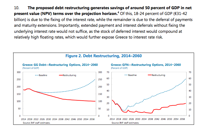 Το ΔΝΤ επιμένει στην ανάγκη να υιοθετηθούν από την Ευρωζώνη παραμετρικές αλλαγές - για τις οποίες το Eurogroup είχε δεσμευθεί από το 2012. Δεν προτείνει ονομαστικό κούρεμα του χρέους, όπως αυτό που επιτεύχθηκε το 2012 με το PSI, αλλά περαιτέρω μείωση της παρούσας αξίας του χρέους που είχε μειωθεί δραστικά το 2012 χάρη στο Official Sector Involvement ( OSI που είχε επιτευχθεί το 2012 παραλλήλως προς το PSI). Προτείνει ένα συνδυασμό περαιτέρω επέκτασης των λήξεων, παράτασης της περιόδου χάριτος ως προς την καταβολή τόκων και σταθεροποίησης των κυμαινομένων επιτοκίων στα τρέχοντα χαμηλά τους επίπεδα. Αθροιστικά υπολογίζει τη μείωση - με τους τρόπους αυτούς - του χρέους σε παρούσα αξία κατά 50 % του ΑΕΠ. Το 2012 η μείωση ήταν 50% του ΑΕΠ σε ονομαστική αξία και 50 % του ΑΕΠ σε παρούσα αξία μόνο μέσω του δανείου του EFSF χωρίς να υπολογίζονται άλλες παράμετροι που μειώνουν την παρούσα αξία.