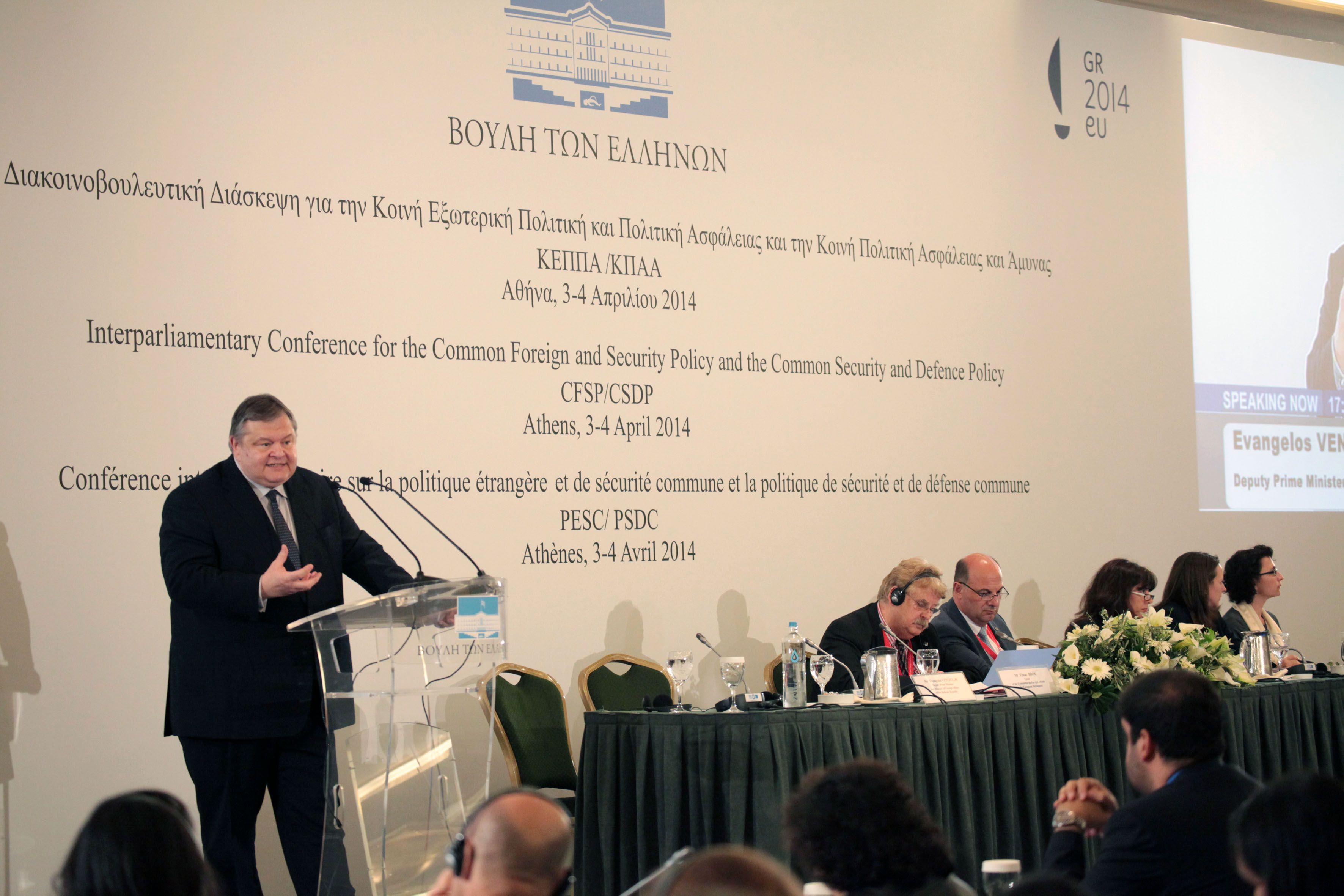 Ομιλίας του Αντιπροέδρου της Κυβέρνησης και Υπουργού Εξωτερικών Ευάγγελου Βενιζέλου στη Διακοινοβουλευτική Διάσκεψη για τον έλεγχο της Κοινής Εξωτερικής Πολιτικής και Πολιτικής Ασφαλείας και της Κοινής Πολιτικής Ασφάλειας και Άμυνας, με θέμα «Προκλήσεις ασφαλείας στη Νότια Γειτονία της Ευρωπαϊκής Ένωσης. Η ελληνική οπτική» (Καβούρι, 3.4.2014).